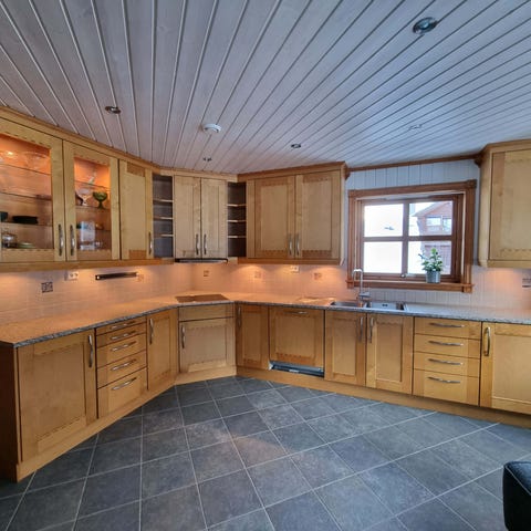 Flere kjøkkenskap i tre med klassisk design, inkludert overskap og underskap med skapdører og skuffer. Innerdør i tre med vindusfelt og panel. Møblene har naturlig trefarge og passer til tradisjonelle interiørstiler. Det følger med en Miele oppvaskmaskin, ca 10 år gammel, et Bosch kjøleskap, ca tre år gammelt, en Whirlpool stekeovn, ca seks år gammel.