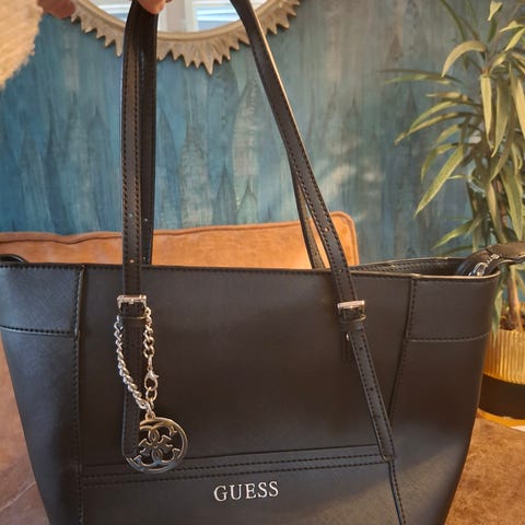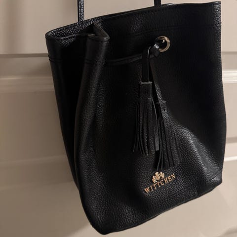 Den svarte vesken er en Wittchen tote- eller shopper-veske, sannsynligvis fra deres Elegance Collection. Den er laget av skinn eller imitert skinn og har karakteristiske kjede- og lærhåndtak, samt merkets logo foran.
