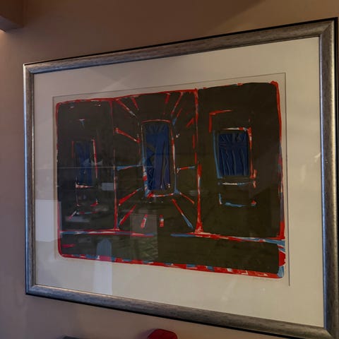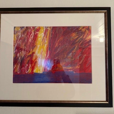 Abstrakt maleri med dominerende gule og oransje farger.