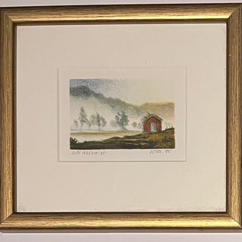 Hyggelig akvarell. "Sommerhus, båt og brygge". Signert: Per Nagelstad -81.