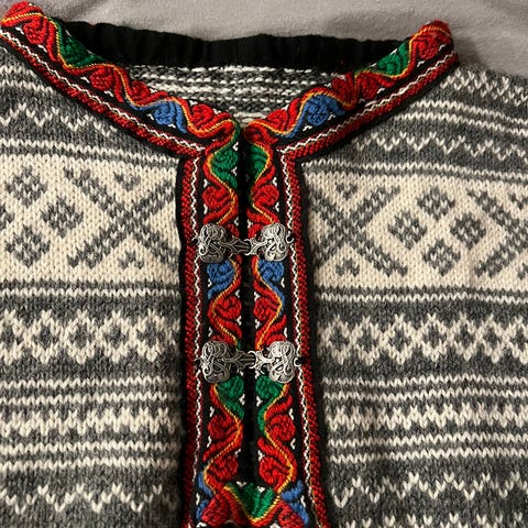 Håndstrikket ullgenser med rundfelling og Selbu-inspirert diamantmønster