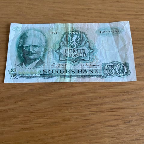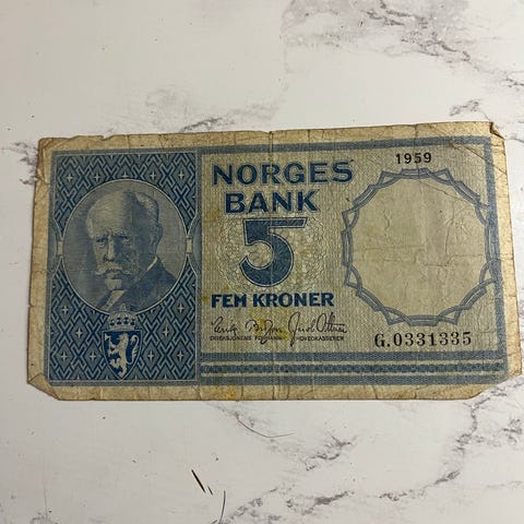 Norges Bank 5 Kroner seddel fra 1959. Sedlene er blå i fargen og viser detaljerte illustrasjoner av norsk natur og arbeid. Sedlene har synlige bruksmerker og bretter.Kan sendes men ikke fiks ferdig! Se bilder for stand og utseende ! Selges som den er!