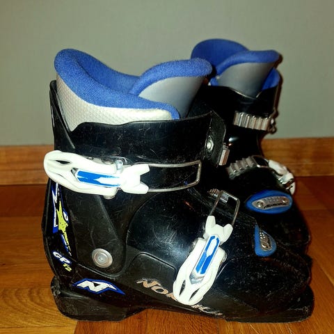 Både ski og sko ble kjøpt til en 5 åring for to år siden, og har fungert kjempefint som «begynnerski». Lettvint med bare to fester på skoene når det er små fingre som skal ta de på :) Bindingene er tilpasset disse skoene, men er lette å stille inn.