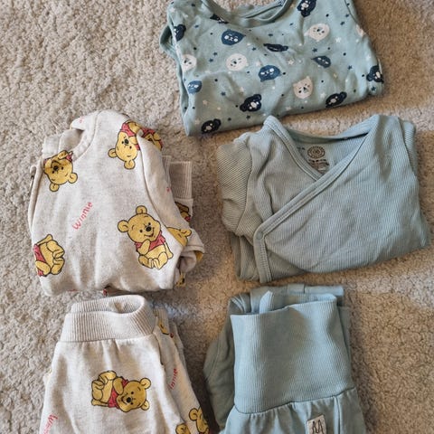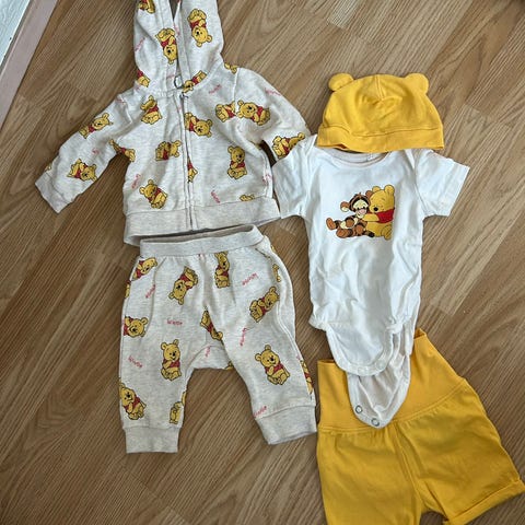 Selger en nydelig og gjennomført klespakke til baby/gutt, perfekt for deg som elsker Disney, Ole Brumm (Winnie the Pooh) og søte detaljer. Myke, behagelige og pent brukte plagg i gode kvaliteter.