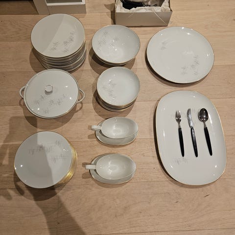 Flott kaffeservise fra Hutschenreuther. Tysklands eldste porselensprodusent. Har tallerken, tefat og kopper til 8 pers, men har i tillegg noen flere tallerkner og tefat hvis ønskelig. Ingen skår eller skader. Kan sendes mot frakt-tillegg.