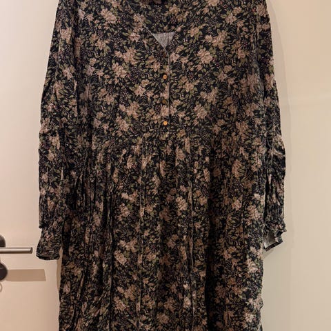 Kjolen er pent brukt. Str. S, som tilsvarer str. 42/44. Romslig i størrelsen. Brystmål fra armhule til armhule er 61 cm, og hel lengde fra skulder og ned er 99 cm. Kjolen er i 100% viskose.