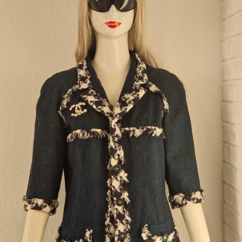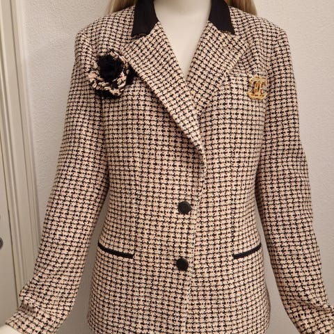 Chanel jakker i størrelse 40 - norsk 38. Jakken er laget av ull blanding og har en beige farge med svarte detaljer. Den har flere lommer og en klassisk design. Delikate knapper med chanel logo. Diskret og elegant. Fremstår som ny. Foret med mykeste silke.