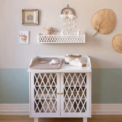 Cam Cam Copenhagen Harlequin stellebord selges. Stellebordet/kommoden er hvit, med skapdører og hyller med god plass for klær og oppbevaring ved stelleplassen. Designet for å gi en funksjonell og praktisk løsning ved stelleområdet. Platen på toppen kan justeres slik at møbelet kan brukes videre som kommode når man ikke lenger har behov for stellebord. Pent brukt og i veldig god stand. Dansk design og høy kvalitet.