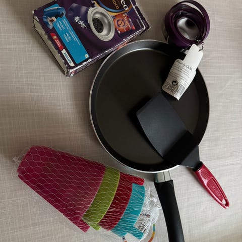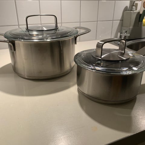 IKEA grytesett i rustfritt stål med flere lokk. Grytene har håndtak og er egnet for matlaging. Settet inkluderer gryter med ulike størrelser og tilhørende lokk i klart materiale med håndtak. Grytene er godt brukt, må hentes