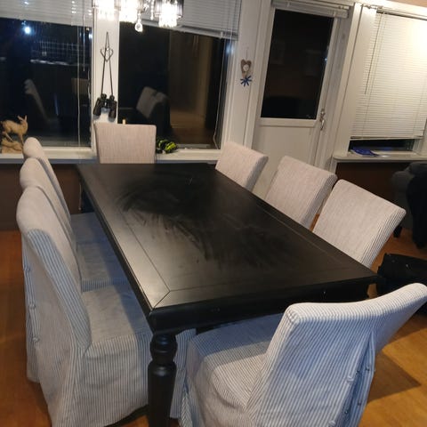 Pent brukt spisestuebord med 6 stoler og 2 venger som også hører til selges billig pga flytting.