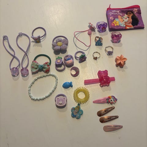 Assorterte hårbånd til baby og dukker i ulike design og farger. Materialer inkluderer blonder, satengbånd og dekorative detaljer som blomster og sløyfer. Passer til dukker og babyer.