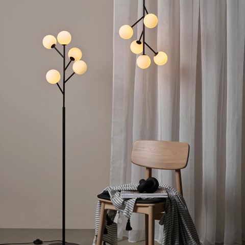 Lampen har en sølvfarget metallbase med hengende klare krystallkuler rundt tre lyskilder. Ene lyspæren har gått tom og tatt ut. Lampen lyser godt med to pærer også, vi har derfor ikke satt inn ny av den tredje lyspæren. Taklampen fungerer fint.