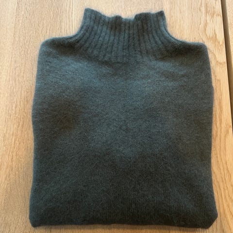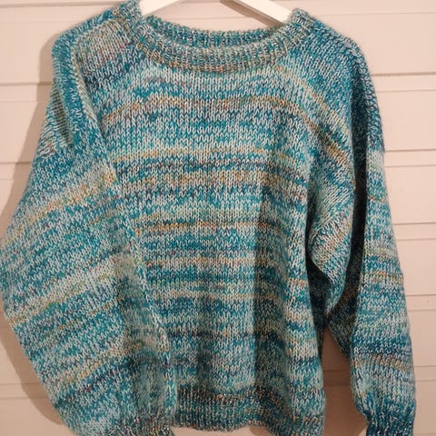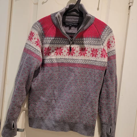 Vasket med vaskemiddel for ull. 60% ull, 40% akryl. Varm og god genser. True to size. Se gjerne mine andre annonser. Jeg kan, om det lar seg gjøre, pakke flere ting i samme forsendelse for å spare frakt.