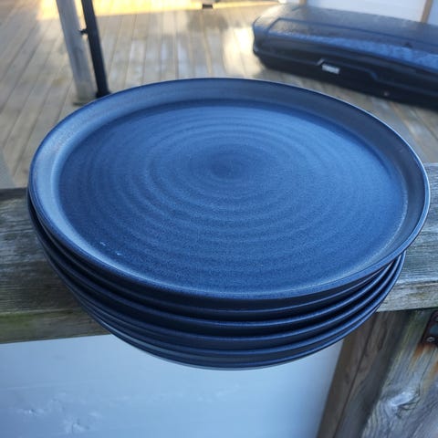 Rusta servise i keramikk, blå. Inkluderer tallerkener og skåler. Passer til daglig bruk og ulike måltider. Må hentes.