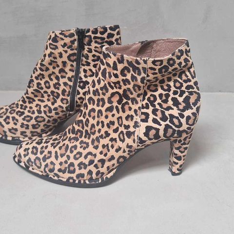 Laboutin støvletter med leopardmønster i størrelse 40. Støvlene har høye hæler og plattform foran. Sålen er rød. Svært pent brukt.