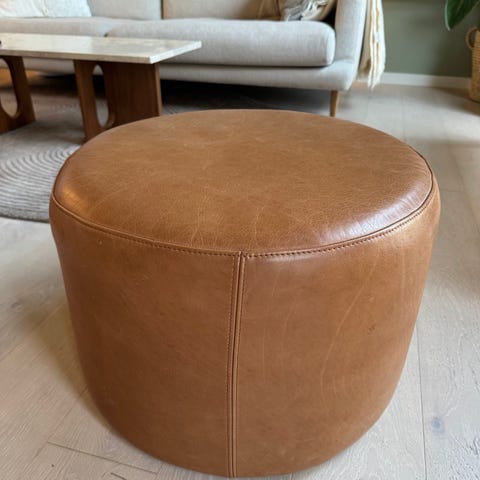Pent brukt fotskammel i skinn til Woood Rodeo sofa selges. Må hentes