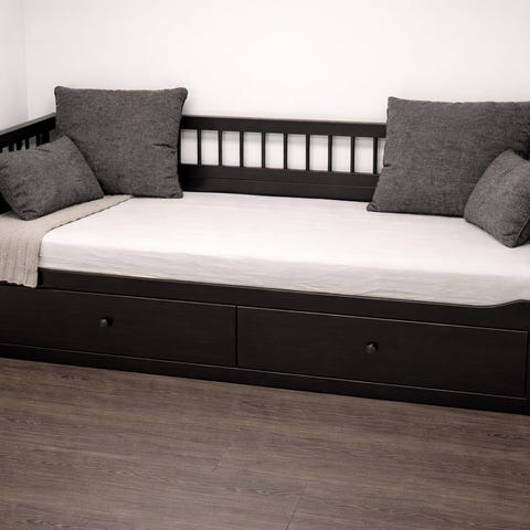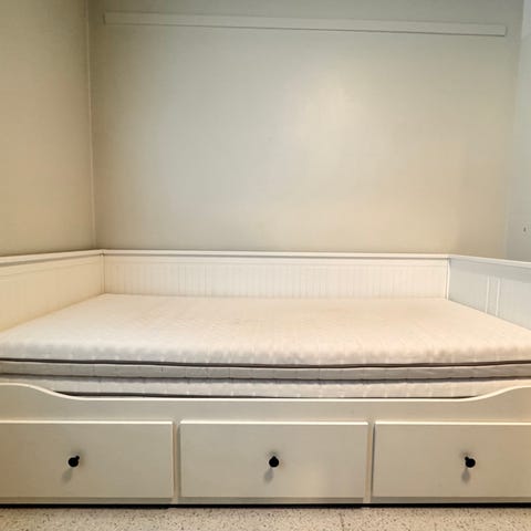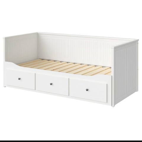 Tre store skuffer kan romme dyne og pute og fungere som en nattbordsskuff. Veldig praktisk og fin til små rom eller leiligheter.