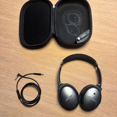 Bose QC25 hodetelefoner med tilhørende etui og ekstra tilbehør. Hodetelefonene har en over-ear design og leveres med ekstra kabel og nye øreputer.