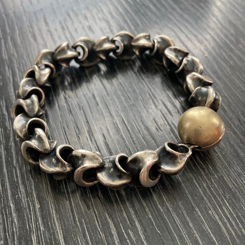 Selger et massivt og tungt sølvarmbånd fra Jens Aagaard, i klassisk oksidert design. Armbåndet har et kraftig, organisk uttrykk og høy kvalitet – dette er ikke et lett smykke, men et solid statement-armbånd.