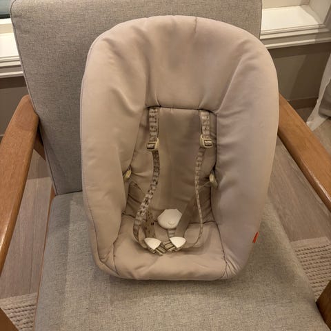 Stokke tripp trapp newborn set i grå, veldig pent brukt uten bruksmerker. Kjøpt i 2025 og lite brukt til ett barn. Lekebøyle medfølger. Trekket er nyvasket med allergivennlig vaskemiddel og klart til bruk. Dyre- og røykfritt hjem.