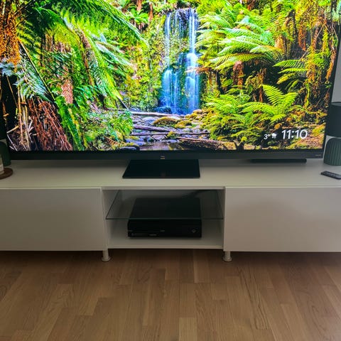IKEA TV-benk i hvit høyglans farge med flere oppbevaringsmuligheter inkludert skuffer og åpne hyller. Designet for å romme elektronikk og medieutstyr, laget i slitesterkt materiale. Passer for stue eller underholdningsområder.