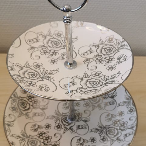 Håndlaget kakefat sett med tre nivåer, laget av porselen med gullfargede detaljer. Passer til servering av kaker og småretter. Fatene er laget av gjenbruksporselen, så hvert fat er helt unikt.
