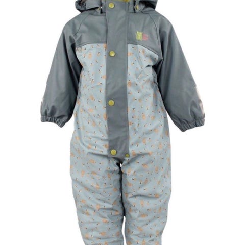 Kattnakken foret regndress / vinterregndress i størrelse 86, unisex. Dressen er rød med mønster av skog og rev. Den har hette og glidelås.