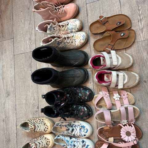 Sko pakke selges samles til jente med varierte størrelser. Noen sko godt brukt (men fortsatt mye bruk igjen), mens andre er omtrent ikke brukt.