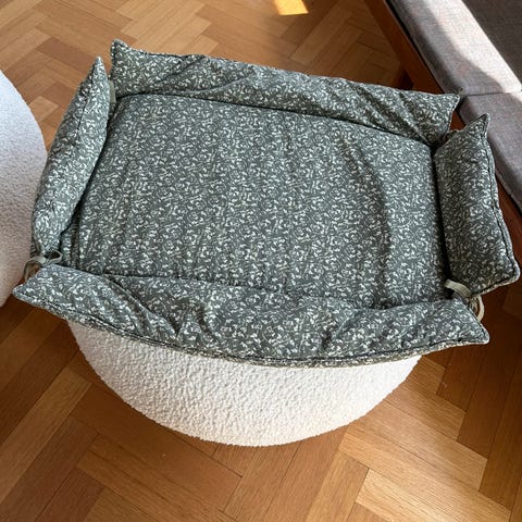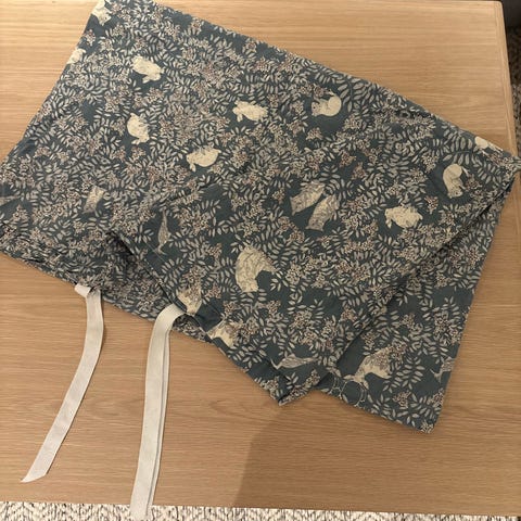 Sprinkelbeskytter i beige med blått/grønt blomstermønster. Ubrukt. Størrelsen er 30 X 300 cm. Fin qulitet kvalitet.