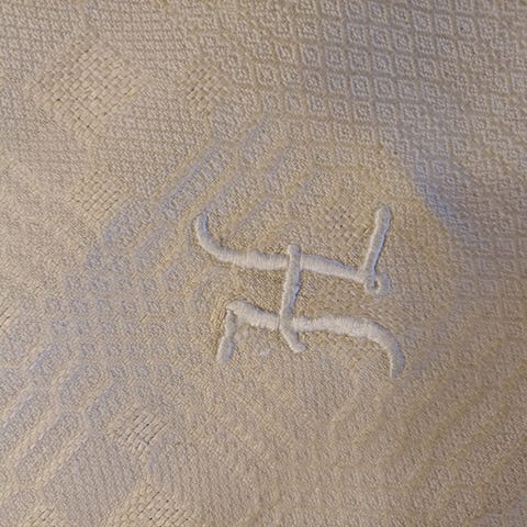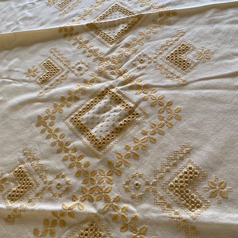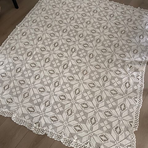 Gammel, fin duk uten flekker eller slitasje. Nyvasket og rullet.