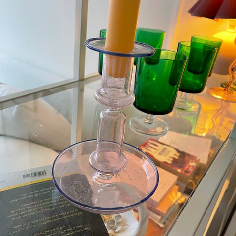 Hay Tiny lysestaker laget av borosilikatglass i gjennomsiktig farge. Hver lysestake har mål på 7 cm i bredde, 7 cm i dybde og 7,7 cm i høyde. Kr 100,- for begge 2 .