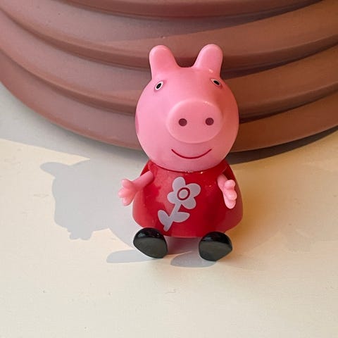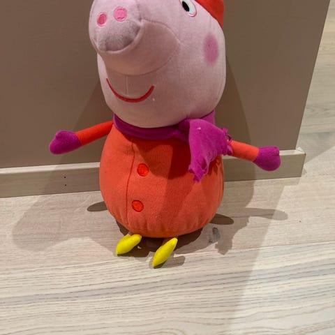 Peppa Gris kosedyr i rødt. Mykt kosedyr med detaljer som lue og klær. Passer som leketøy for barn.