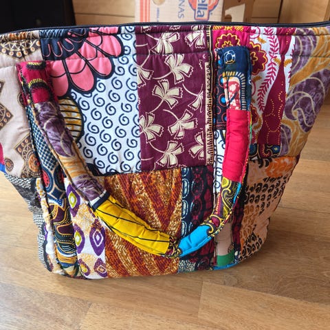 Jeg har sydd veske av et brodert åkle med lin bakside. Foret med lyst stoff og hanke av ei bomullsgardin. Alt gjenbruk, derav navnet Bærekraft. Mål på bilder.