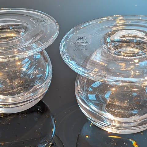 Finn Schjøll glassvase fra Magnor Glassverk i klart glass. Den veldig lite brukt og tar kun opp plass. Høyde målt til ca. 15 cm. Kan brukes som dekorativ gjenstand eller til blomster.