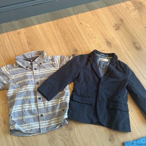 Dress med skjorte og vest. Buksen har strikk i livet og lommer i sidene. Jakken mangler en knapp foran.