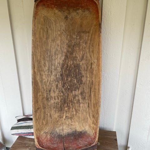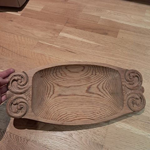 Trauet har en rektangulær form med avrundede hjørner og en rustikk overflate. Kan brukes til servering eller dekorative formål. Lengde 87cm og bredde 41 cm