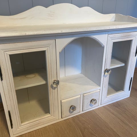 Hyllen er stødig og i god brukt stand, med noe normal slitasje som følger alderen. Perfekt til bøker, pyntegjenstander, planter eller som oppbevaring i stue, gang eller hjemmekontor.
