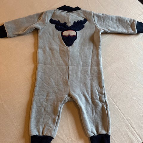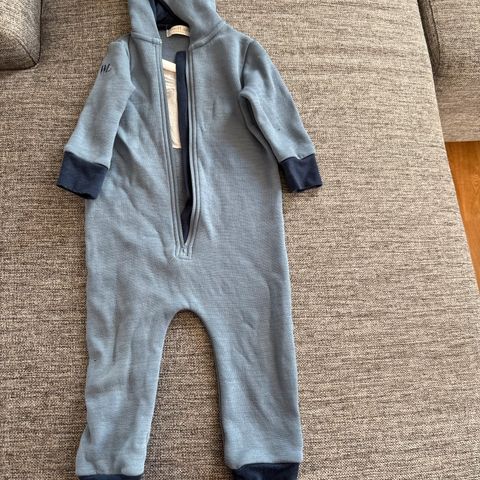 WoolLand barnedress i merinoull, størrelse 74, farge blå. Passer for både gutter og jenter. Laget av merinoull som gir varme og komfort. Dressen har skulderstropper og en liten lomme med dekorativt mønster foran.