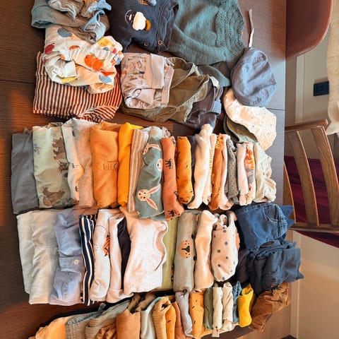 Newbie og kappahl barneklær i størrelse 74 med flerfarget design. Inneholder ulike plagg med ulike mønstre med dyretema og farger, alt fra joggedresser til pysj. Passer for både gutter og jenter.