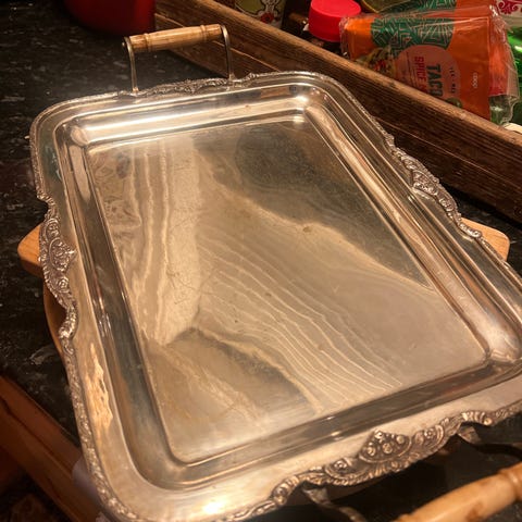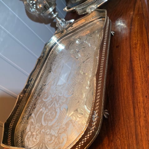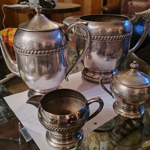 Fløtesett, sjampanjekjøler/isbøtte med tang, kaffekanne, lysestaker, egglass, skål, serviettholder, glassunderlag - selges samlet. Brettet de står på følger ikke med.