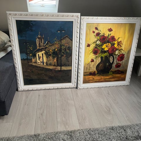 A. Grynne oljemalerier med motiver av by- og havnelandskap. Fem malerier i ulike størrelser, alle innrammet. Motivene viser byer, havner og bygninger, malt i oljemaling på lerret. Passer for samlere eller som dekorasjon.