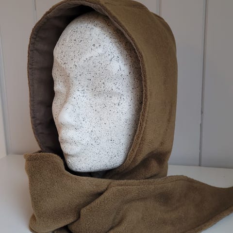 Hjemmesydd hetteskjerf i et ullstoff. Samme stoff inni.