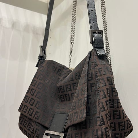 Selger min flotte vintage Fendi mini mama veske, rosa metallisk stoff og gull detaljer- dette er vesken som passer til alt! Siden den både er sølv og gull i tonene- passer den til all slags smykker og sesonger. Autentisk og i helt super stand, ren og pen inni og lite slitasje.