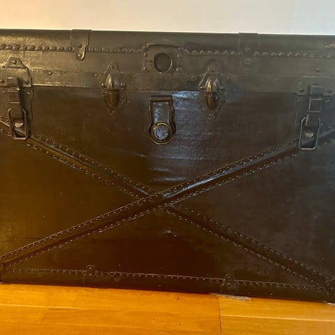Vintage Amerikakoffert, godt brukt. Bredde 92 cm, høyde 35 cm, dybde 48 cm. Produsert i Rio de Janeiro "Casa Marinho".