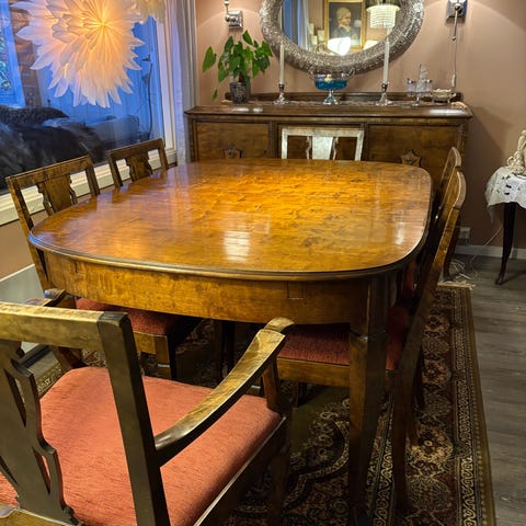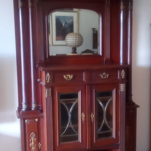 Antikk skjenk i tre med speil og dekorative utskjæringer