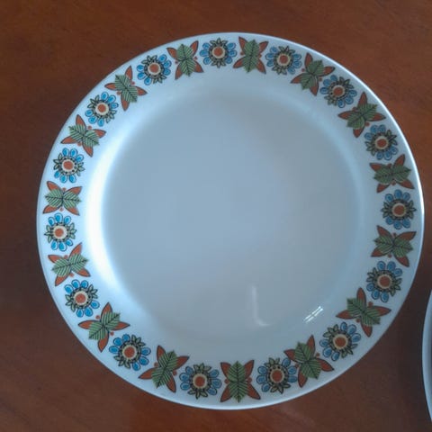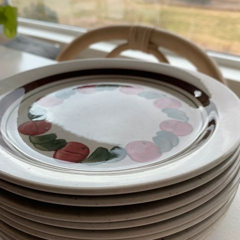Et dekorativt lite firkantet fat i "Tourist"-mønsteret, designet av Inger Waage for Stavangerflint på 1960-tallet.