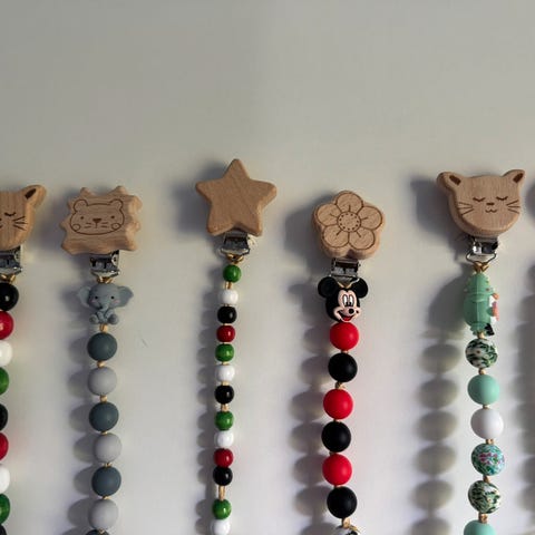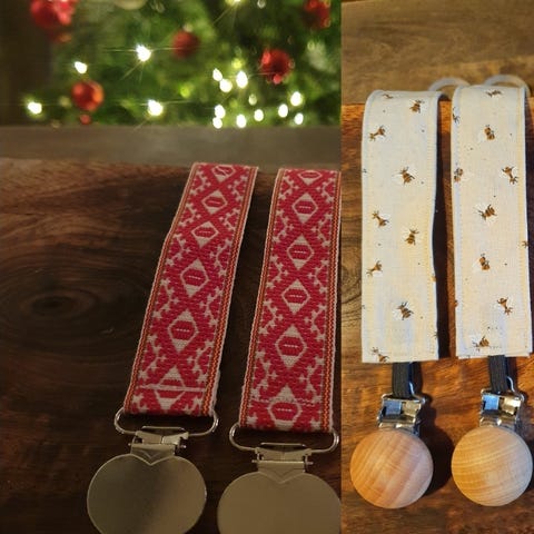 Håndlagde smokkelenker i forskjellige design. Laget av bomull kjøpt i Norge, skånsom og trygg for babyens hud. Spør gjerne om flere design :)