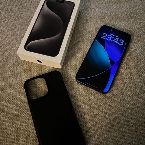 Apple iPhone 15 Pro Max mobiltelefon med 256 GB lagringskapasitet. Telefonen har en moderne design og er egnet for brukere som trenger god lagringsplass til apper, media og filer. Med eske og ledning.