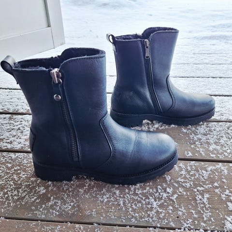 Laget av vanntett nappaskinn, med et varmt og mykt fôr av lammeskinnspels (også innersålen).