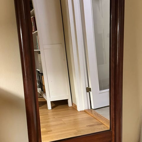 Selger et vakkert veggspeil i mahogny, med integrert hylle under. Speilet har flotte detaljer, søyler på sidene og dekorativ topp. Måler 57 cm bred, og total høyde med «ben» er ca 170 cm.